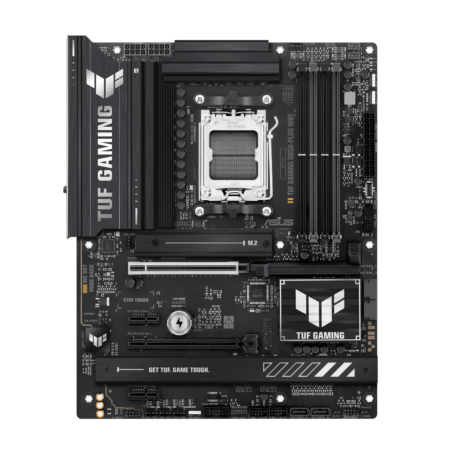 ASUS TUF GAMING B850-PLUS WIFI takes all the essential elements of the latest AMD Ryzen™ processors and combines them with game-ready features and proven durability.